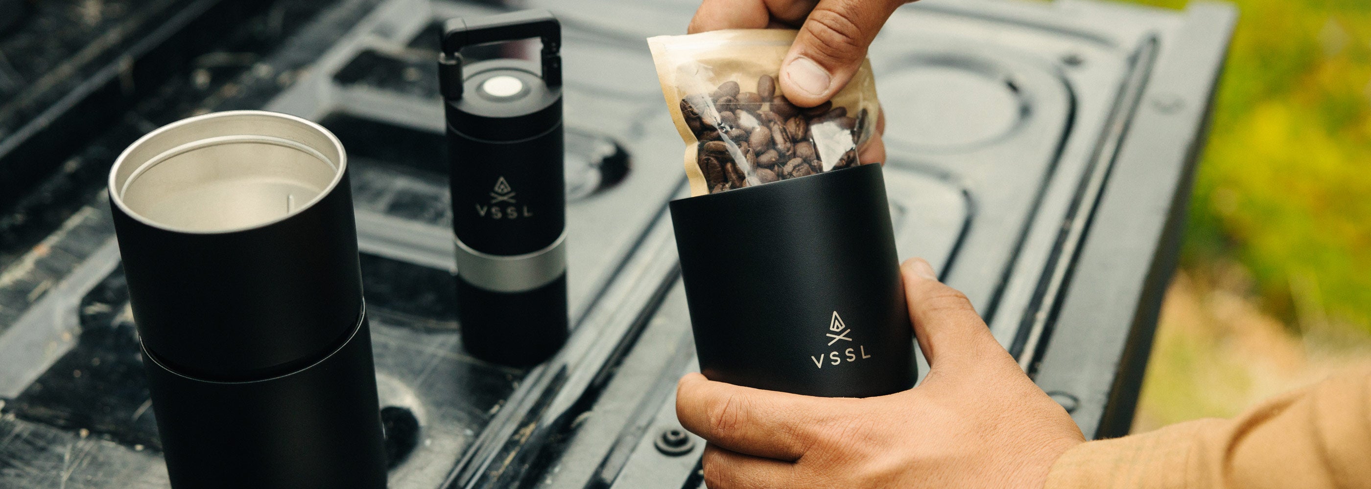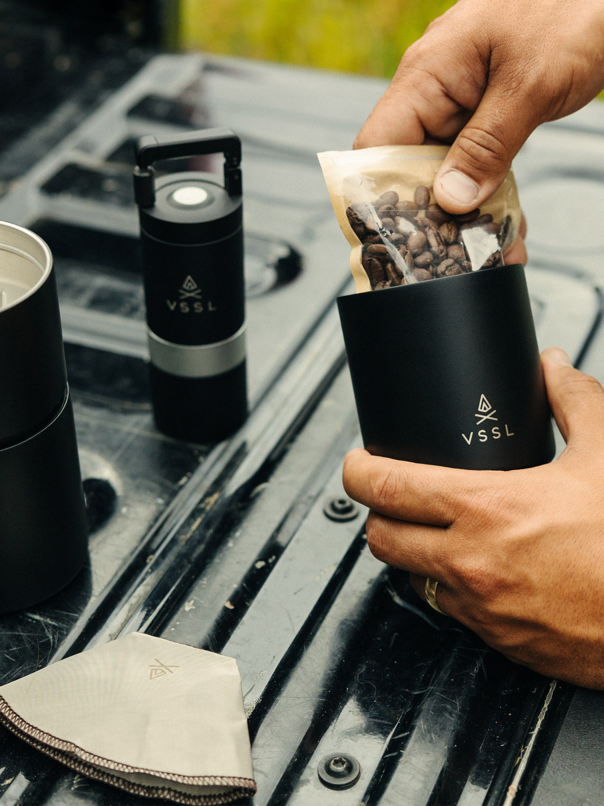 This kit is a fully integrated brewing system purpose-built for adventure. Simply nest components for travel, grind fresh beans, then place the pour over device with the reusable stainless steel mesh filter atop the mug and brew.